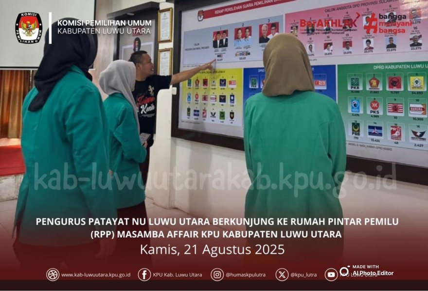 Masamba, kab-luwuutara.kpu.go.id - Komisi Pemilihan Umum (KPU) Kabupaten Luwu Utara (Lutra) menerima kunjungan pengurus PATAYAT Nahdlatul Ulama (NU) Luwu Utara ke Rumah Pintar Pemilu (RPP) Masamba Affair, Kamis (21/8/2025).