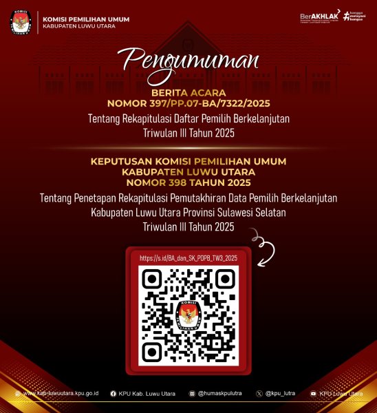 KPU Kabupaten Luwu Utara melakukan Rapat Pleno Terbuka Rekapitulasi dan Penetapan Daftar Pemilih Berkelanjutan Triwulan III Tahun 2025 tingkat Kabupaten Luwu Utara pada hari Kamis tanggal 2 Oktober Tahun 2025, bertempat di Aula Demokrasi Kantor KPU Kabupaten Luwu Utara yang dituangkan dalam Berita Acara Nomor : 397/PP.07-BA/7322/2025 dan Surat Keputusan Nomor : 398 Tahun 2025.