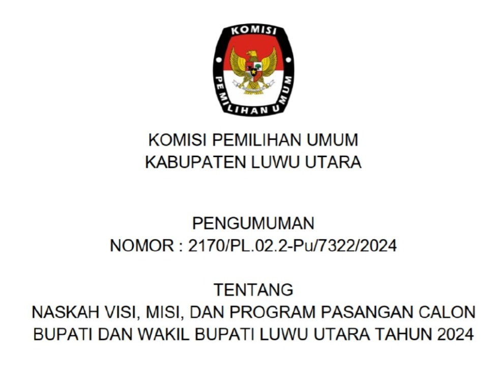 Bersama ini Komisi Pemilihan Umum Luwu Utara mengumumkan visi dan misi pasangan calon Bupati dan Wakil Bupati Kabupaten Luwu Utara Tahun 2024 Minggu, 15 September 2024 00:00 1831 Komisi Pemilihan Umum Kabupaten Luwu Utara mengumumkan visi dan misi pasangan calon Bupati dan Wakil Bupati Kabupaten Luwu Utara Tahun 2024 Klik disini..... Bagikan: Dilihat 1,831 Kali.