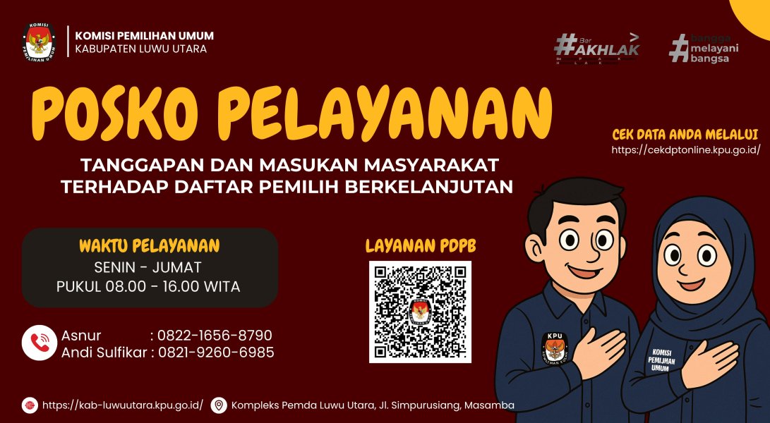Pemutakhiran Data Pemilih Berkelanjutan yang selanjutnya disingkat PDPB adalah kegiatan untuk memperbaharui Data Pemilih berdasarkan DPT Pemilu atau Pemilihan terakhir dan telah disinkronisasikan dengan data kependudukan secara nasional termasuk luar negeri, maka untuk Pemutakhiran Data Pemilih Berkelanjutan (PDPB) KPU Kabupaten Luwu Utara membuka Posko Pelayanan PDPB baik datang lansung ke Kantor KPU Kabupaten Luwu Utara atau melalui link https://s.id/LAPOR_DATA_PEMILIH_BERKELANJUTAN atau dengan scan barcode