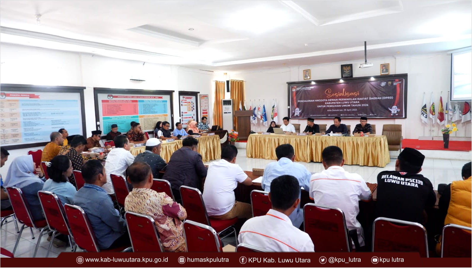 Masamba kab-luwuutara.kpu.go.id - Komisi Pemilihan Umum (KPU) Kabupaten Luwu Utara (Lutra) menggelar sosialisasi pencalonan anggota dewan perwakilan rakyat daerah (DPRD) Kabupaten Luwu Utara untuk pemilihan umum (pemilu) tahun 2024. Kegiatan berlangsung di aula demokrasi Jum'at, 28 April 2023.