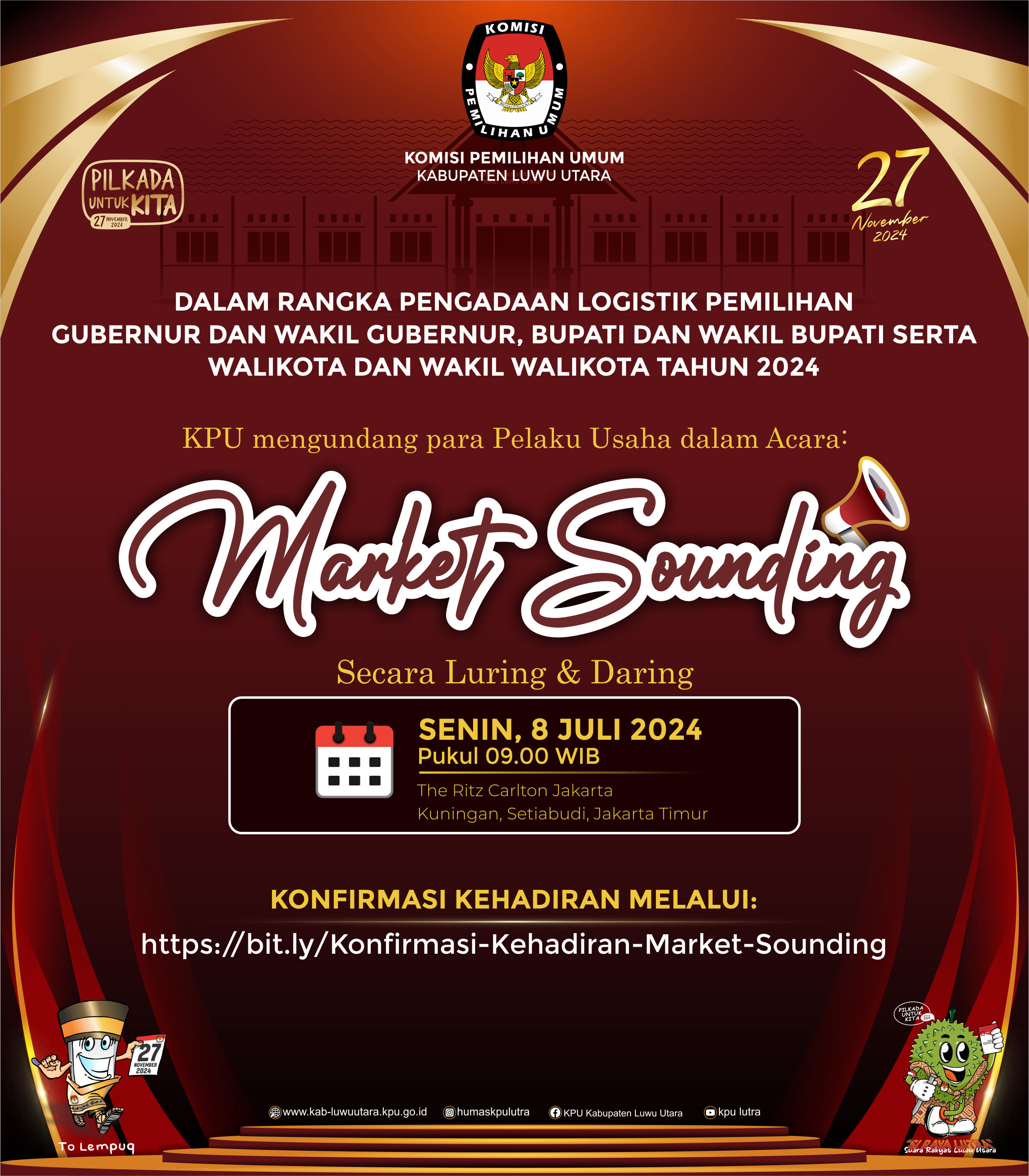 Dalam rangka menindaklanjuti Surat Dinas Sekretaris Jenderal KPU Republik Indonesia Nomor : 2334/PP.09.2-SD/06/2024, perihal Pemberitahuan/Pengumuman Pelaksanaan kegiatan Market Sounding dalam rangka Pengadaan Logistik Pemilihan 2024 pada Rapat Koordinasi dan Bimbingan Teknis Persiapan Pengadaan Logistik Pemilihan Gubernur dan Wakil Gubernur, Bupati dan Wakil Bupati, serta Walikota dan Wakil Walikota Tahun 2024.