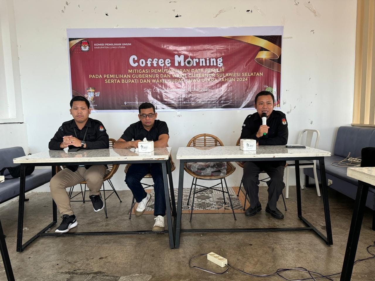 Masamba kab-luwuutara.kpu.go.id - Komisi Pemilihan Umum (KPU) Kabupaten Luwu Utara (Lutra) menggelar Coffee Morning Mitigasi Potensi Masalah Pemuktahiran Data Pemilih untuk Pemilihan Gubernur dan Wakil Gubernur dan Bupati dan Wakil Bupati Luwu Utara tahun 2024. Kegiatan berlangsung di aula warkop Soff coffee Rabu, (17/7/2024)