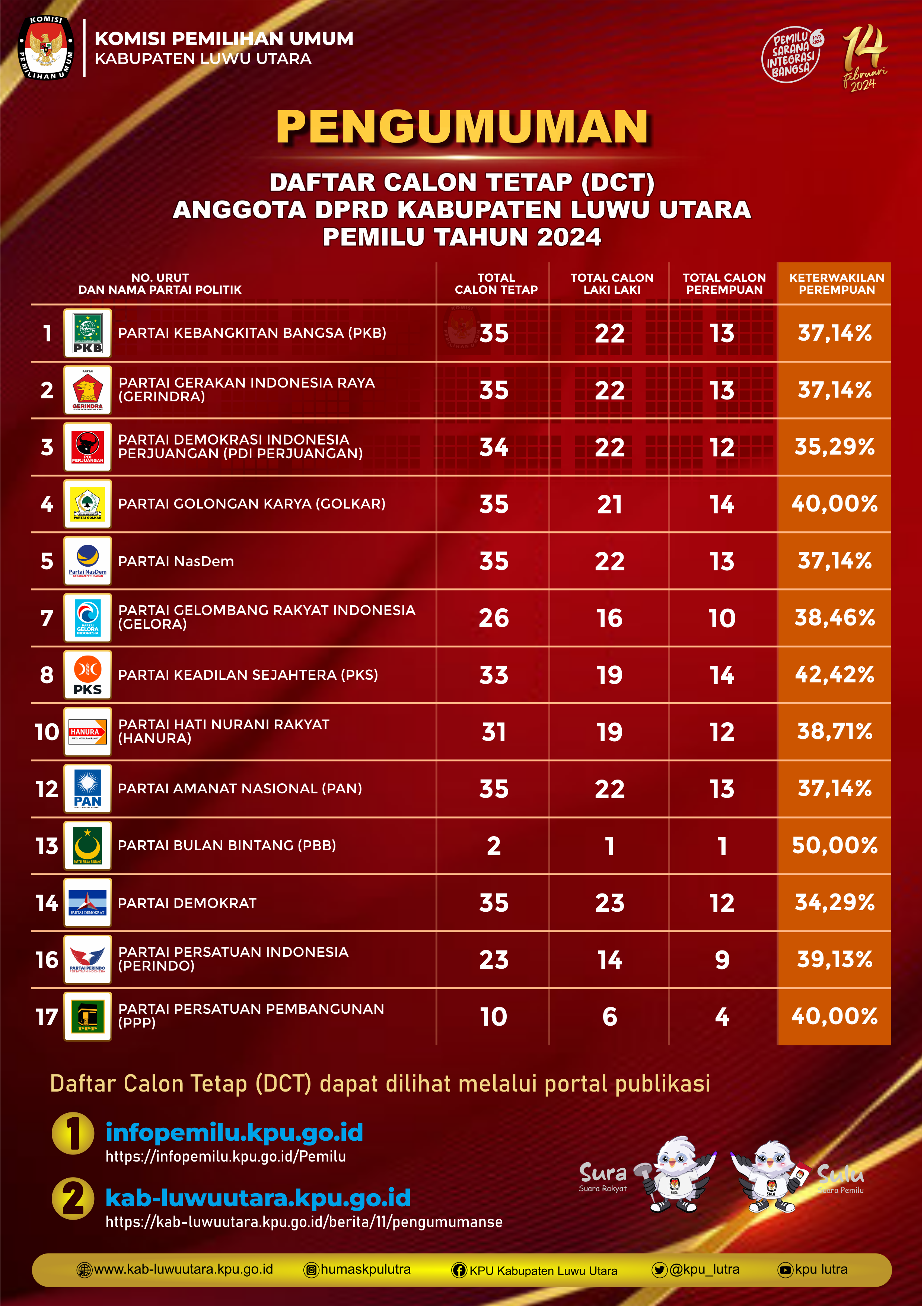 PENGUMUMAN DAFTAR CALON TETAP (DCT) ANGGOTA DPRD KAB. LUWU UTARA DALAM PEMILIHAN UMUM TAHUN 2024