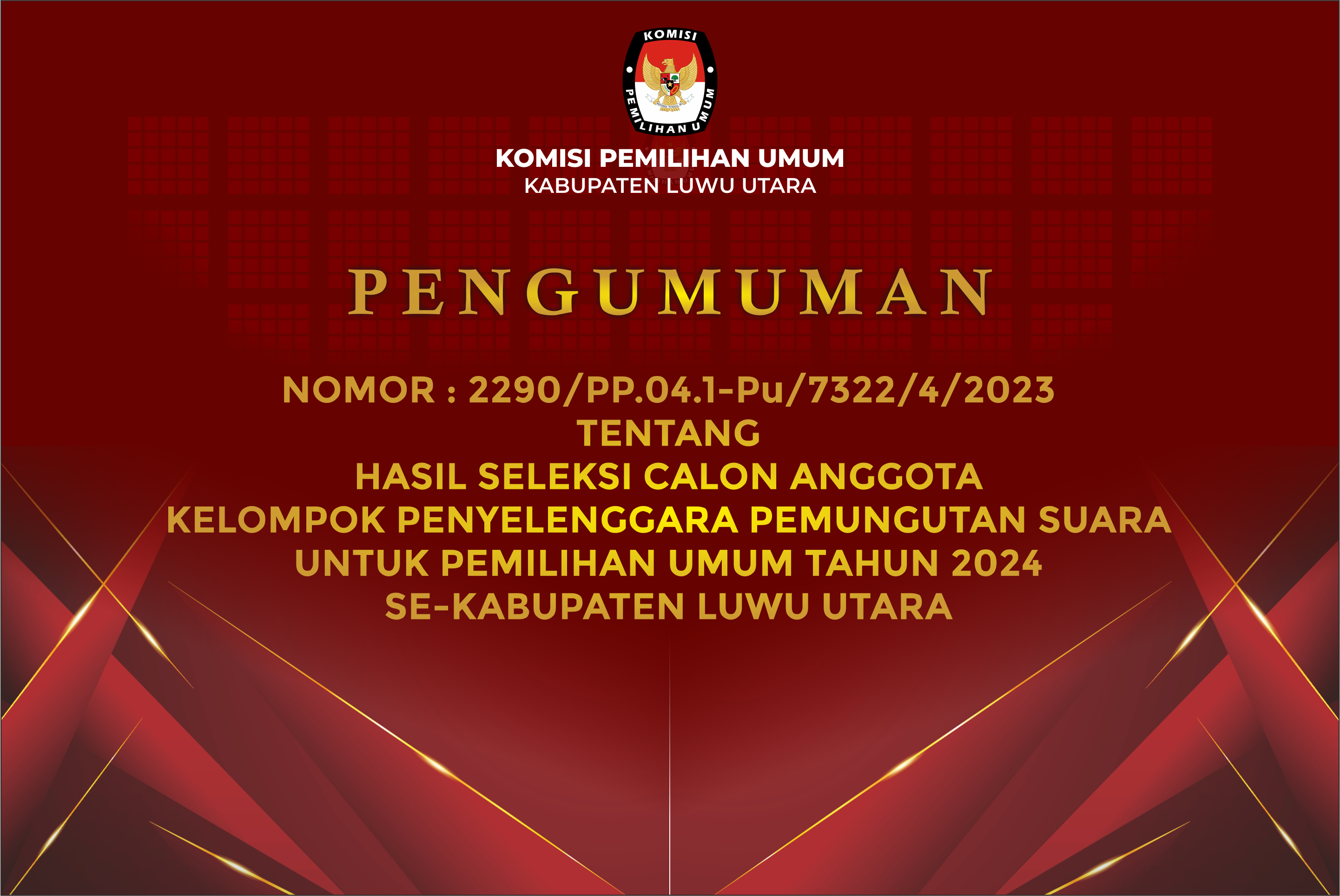 KPU Kabupaten Luwu Utara mengumumkan Seleksi Calon Aggota Kelompok Penyelenggara Pemungutan Suara (KPPS) untuk Pemilihan Umum Tahun 2024.