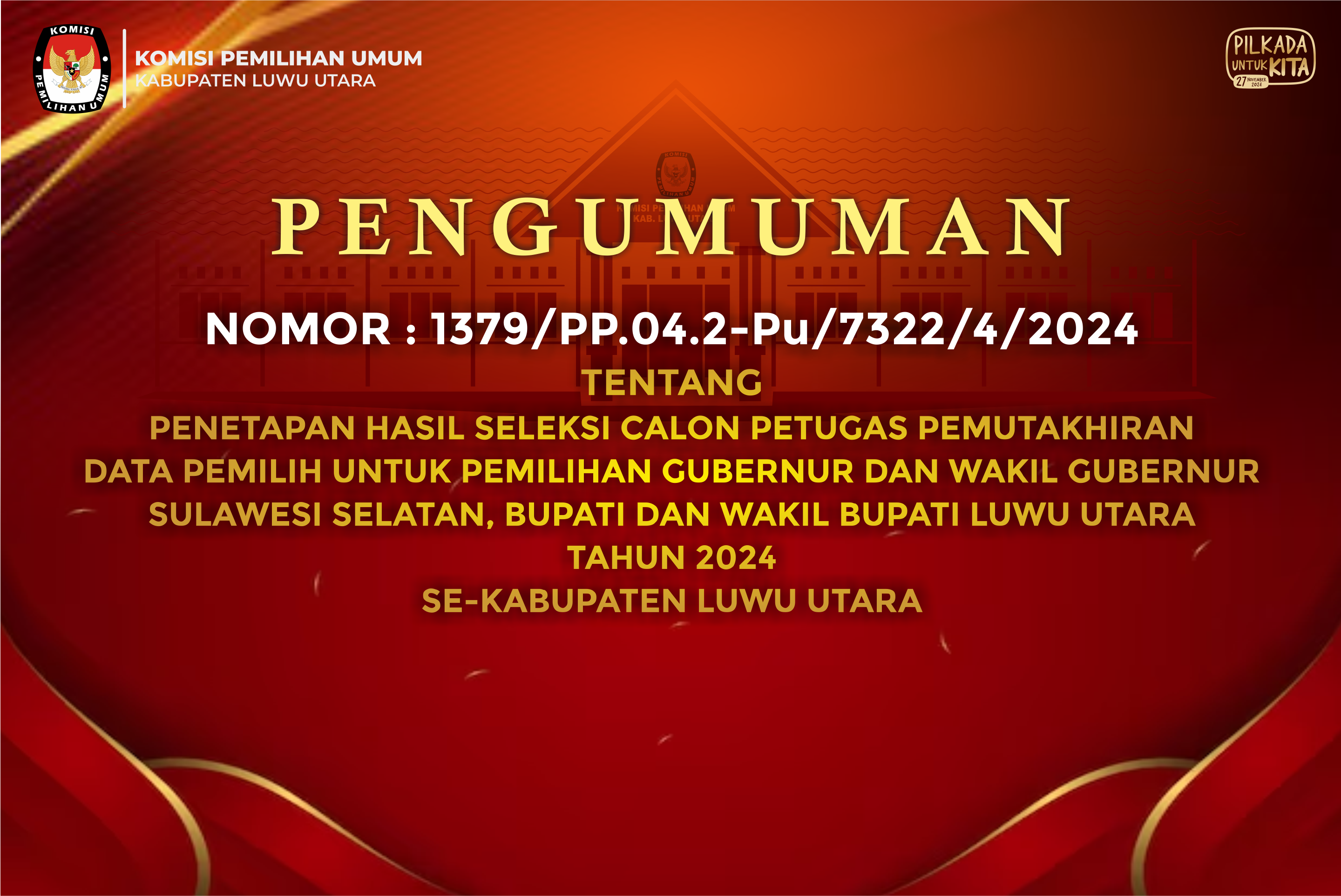 Sehubungan telah dilaksanakannya tahapan Pendaftaran, Penelitian administrasi, dan penetapan calon Petugas Pemutakhiran Data Pemilih untuk Pemilihan Gubernur dan Wakil Gubernur Sulawesi Selatan, Bupati dan Wakil Bupati Luwu Utara Tahun 2024 oleh PPS se-kabupaten Luwu Utara, maka KPU kabupaten Luwu Utara mengumumkan nama-nama calon Pantarlih pada setiap desa/kelurahan yang ada di kabupaten Luwu Utara.