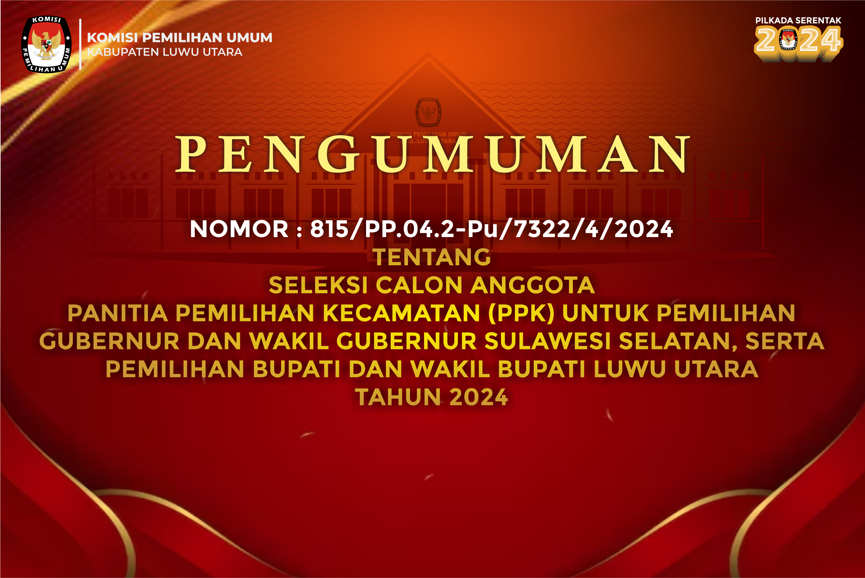 KPU kabupaten Luwu Utara membuka pendaftaran Panitia Pemilihan Kecamatan (PPK) untuk Pemilihan Gubenur dan Wakil Gubenur Sulawesi Selatan, serta Pemilihan Bupati dan Wakil Bupati Luwu Utara Tahun 2024, pendaftaran dimulai dari tanggal 23 s.d 29 April 2024, buruan jangan sampai terlewat...