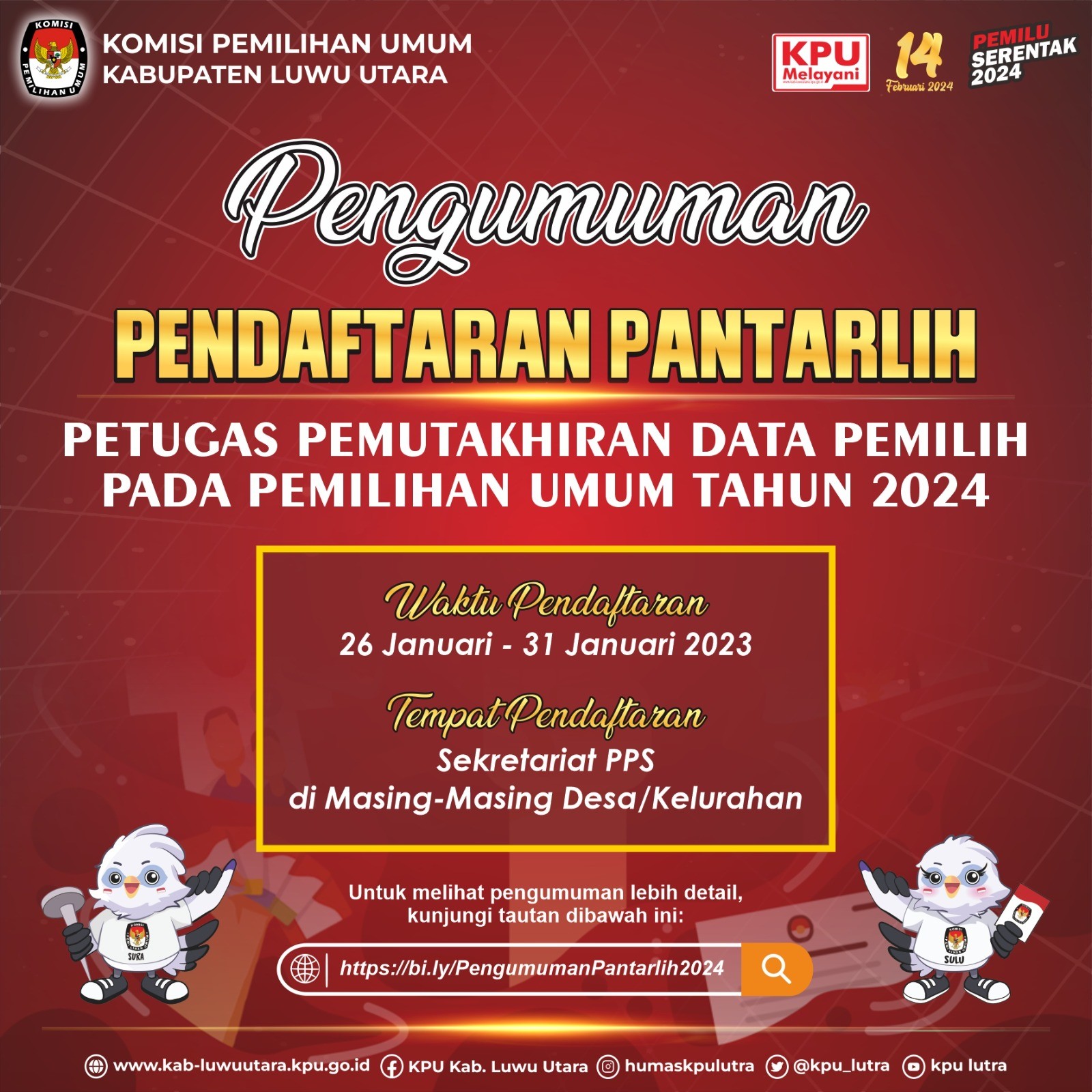 PENGUMUMAN SELEKSI CALON PETUGAS PEMUTAKHIRAN DATA PEMILIH (PPDP) UNTUK PEMILIHAN UMUM TAHUN 2024 Kamis, 26 Januari 2023 00:00 1497 Pengumuman seleksi calon PPDP untuk pemilu tahun 2024 Klik disini... Bagikan: Dilihat 1,497 Kali.