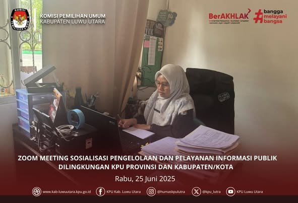 Masamba, kab-luwuutara.kpu.go.id - Komisi Pemilihan Umum (KPU) Kabupaten Luwu Utara (Lutra) mengikuti sosialisasi pengelolaan dan pelayanan informasi publik kegiatan berlangsung melalui media zoom meeting, Rabu (25/6/2025)