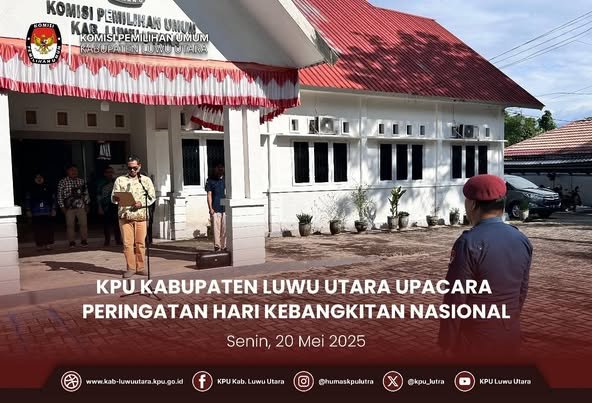 Masamba, kab-luwuutara.kpu.go.id - Komisi Pemilihan Umum (KPU) Kabupaten Luwu Utara (Lutra) menggelar upacara bendera dalam rangka Memperingati Hari Kebangkitan Nasional (HARKITNAS) Ke -117 Tahun 2025, kegiatan berlangsung di halaman Kantor KPU Luwu Utara, Selasa (20/5/2025)